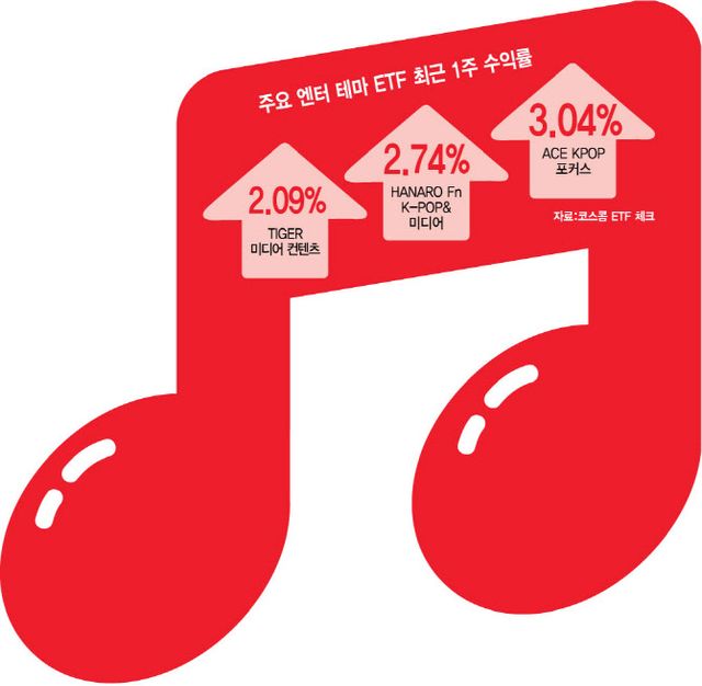 이어 ‘HANARO Fn K-POP&미디어’가 2.74%, ‘TIGER 미디어컨텐츠’가 2.09% 올라 뒤를 이으며 같은 기간 국내 주식형 ETF 수익률 1~3위를 모두 미디어·엔터 테마 ETF가 차지했다. 강진혁 신한투자증권 연구원은 “관세 피해가 없는 미디어·엔터주가 재부각됐다”고 밝혔다.