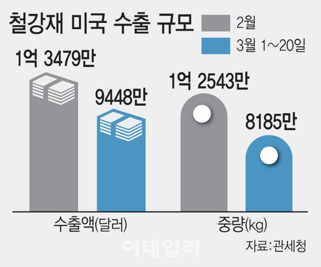 30일 한국무역통계정보포털(TRASS)에 따르면 지난 3월 1~20일 미국으로 수출된 국내 철강재 규모는 8만1852톤(t)으로 집계됐다. 영업일(14일) 기준으로 환산하면 하루 평균 6296t이 수출된 것으로, 이는 지난해 3월(8006t) 대비 약 21% 감소한 수준이다.