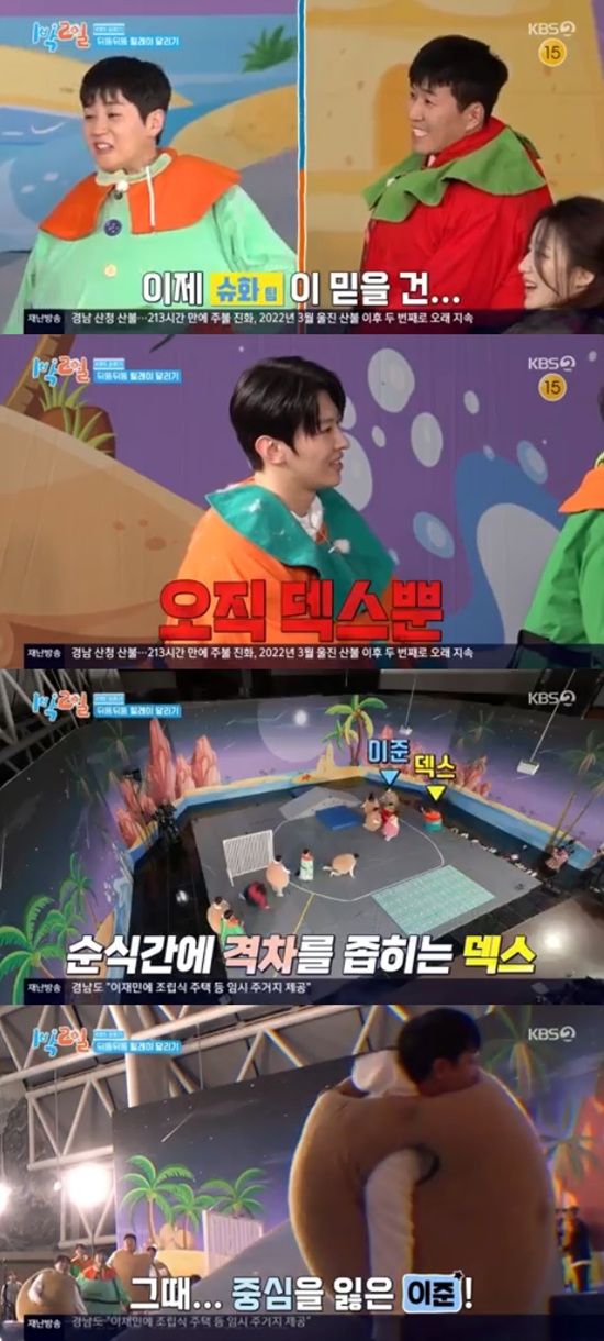 뒤늦게 출발한 덱스는 세 걸음 만에 지압판을 탈출했고 그 사이 이준이 균형을 잃고 삐끗하면서 덱스가 역전을 했다.