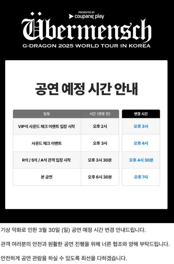 지드래곤 역시 오후 2시부터 현장에서 리허설과 사운드 체크를 진행하며 기상 상황을 주시했지만, 예정된 무대 장치들을 안전하게 활용하기 어렵다는 판단 끝에 공연을 지연시켰다고 설명했다.