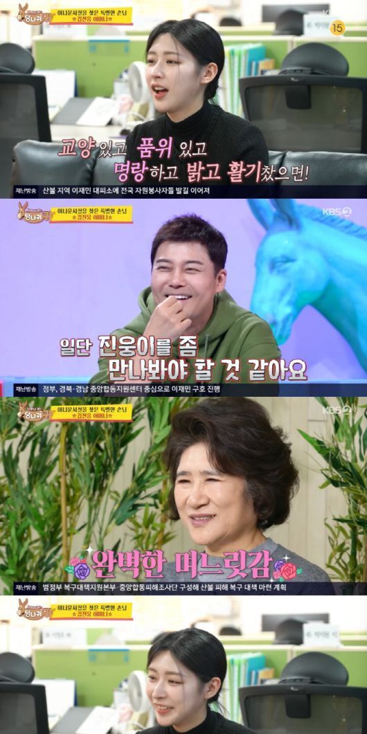 30일 방송된 KBS 2TV 예능 프로그램 '사장님 귀는 당나귀 귀'(이하 '사당귀')에서는 김진웅 아나운서의 어머니가 방송국에 깜짝 방문해 엄지인, 홍주연 아나운서와 만나는 모습이 그려졌다.