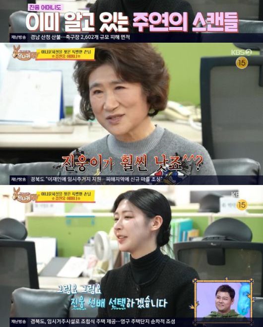 특히 김진웅 어머니는 홍주연에게 '사당귀' 때문에 '결혼설'까지 불거진 전현무와 아들 김진웅 중 누가 더 나은지 직접적으로 물어 모두를 놀라게 했다. 홍주연은 고민 끝에 "김진웅 선배"라고 센스 있게 대답했다.