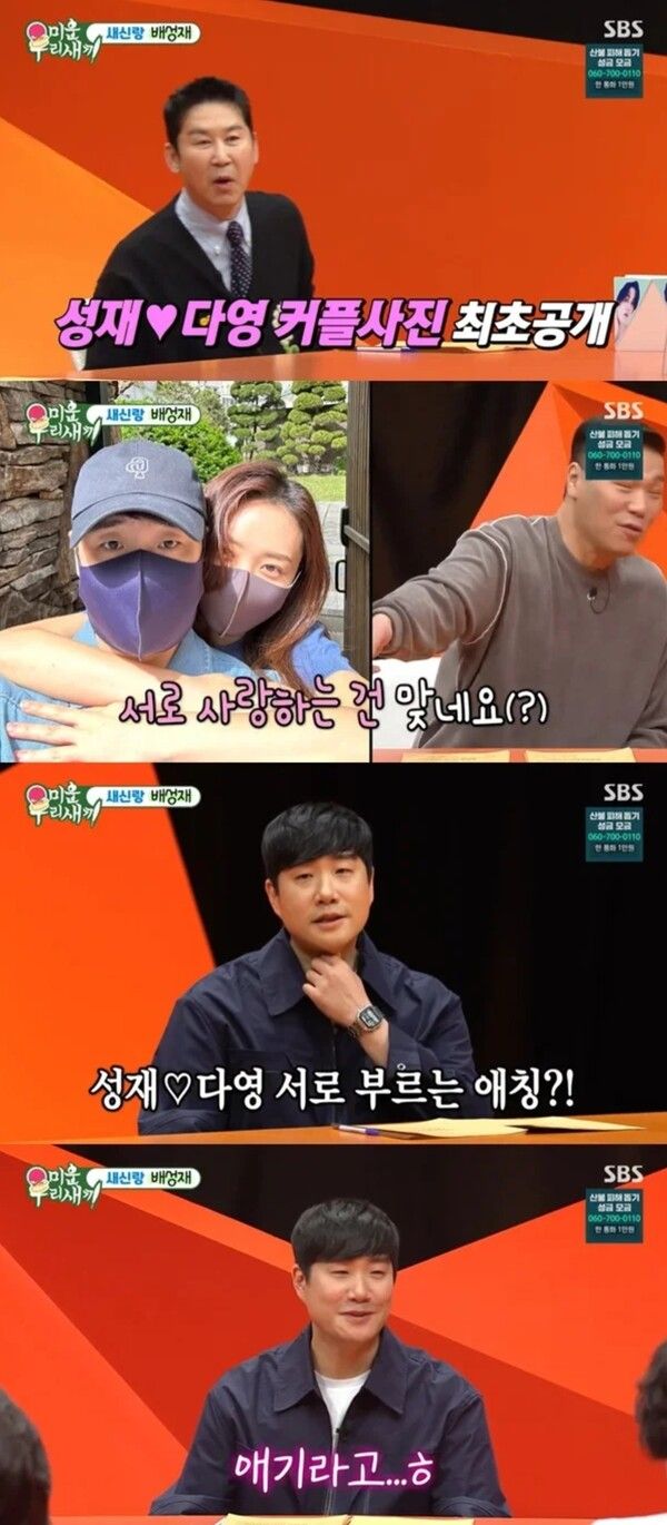 신동엽은 "애칭이 있냐"고 물었고 배성재는 "한동안 선배, 후배 느낌이다가. 민망해서 아기라고 한다"고 답했다.