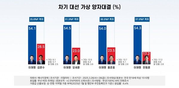 이재명 54.1% vs 김문수 28.5%, 이재명 54.5% vs 오세훈 23.0%, 이재명 54.0% vs 홍준표 23.5%, 이재명 54.3% vs 한동훈 17.2%로 나타났다.