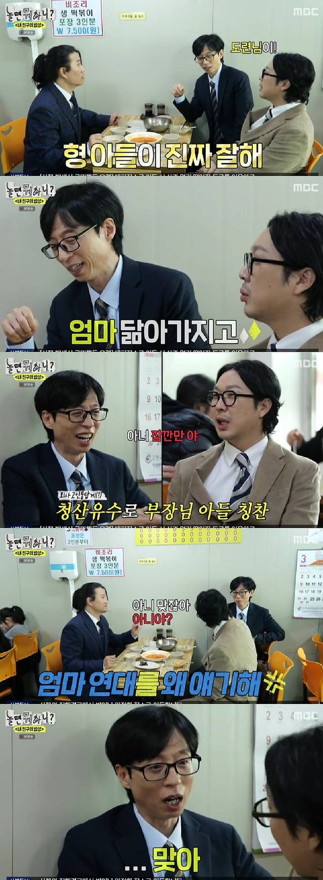 유재석은 "엄마 연대를 왜 얘기하냐"고 발끈했지만 하하가 "아니야?"라고 반문하자 "맞다"고 인정했다. 임우일은 "제가 봤을 때는 무조건 공부는 유전이다"고 거들었다. 하하는 “유전이다. 우리는 (부모가 다 가수라) 목소리"라고 자랑했다.