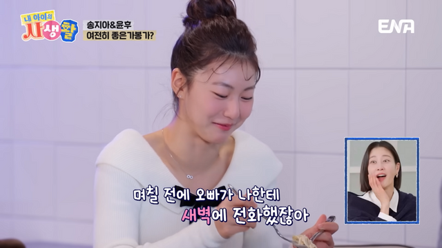 송지아는 아직도 심심할 때 〈아빠!어디가?〉를 돌려본다고 밝혔습니다. 윤후도 “내가 너한테 말을 많이 걸었지, 너 업어주고 너 엄청 예뻐하고”라고 회상했죠. 그러자 송지아는 “그때 나한테 왜 그렇게 잘해준 거냐”라고 물었어요. 윤후는 한치 망설임 없이 “내가 널 좋아했나 보지”라고 돌직구를 던지며 송지아의 얼굴을 또 한번 빨개지게 만들었네요. 송지아는 사레가 들린 듯 콜록거리더니 “나는 남사친이 없다. 그 정도로 연락하는 건 오빠가 유일하다”라고 말했고 윤후 또한 “이렇게 오래되고 진심으로 마음을 터놓을 수 있는 여사친은 너밖에 없다”라고 화답했습니다. 두 사람은 식사를 마치고 카페 한 켠에 마련된 포토존으로 이동했습니다. 송지아가 사진을 찍어주는 윤후에게 "(각도를) 위에서 찍어줬으면 좋겠다", "연사로 많이 찍어주면 좋겠다"라는 등 디테일한 주문을 던졌고요. 윤후는 “어떻게 찍어도 모델이 좋으면 사진도 잘 나와”라고 말하더니 “그러니까 그만 찍어도 될 것 같아”라고 인내심의 한계를 느끼는 모습을 보여 패널들의 웃음을 자아냈어요.