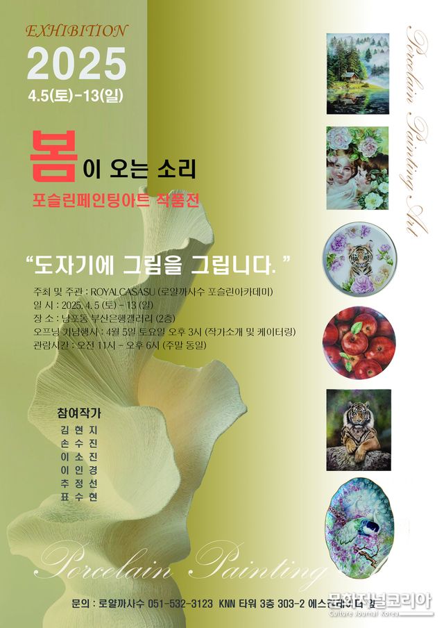 문화저널코리아 조정일 기자 | 따뜻한 봄바람이 불어오는 4월, 감성을 담은 특별한 전시가 부산에서 열린다. 부산에서 활동하는 포슬린 페인팅 아트 작가들이 모여 준비한 작품전 “봄이 오는 소리가 오는 2025년 4월 5일(토)부터 4월 13일(일)까지 남포동 부산은행 갤러리에서 개최된다.
