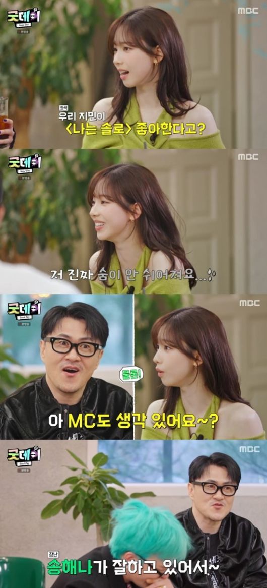데프콘은 카리나에게 "'나는 솔로'를 그렇게 좋아한다더라"라고 말했고, 카리나는 "너무 좋아한다. 진짜 미쳐버릴 것 같다. 숨이 안 쉬어질 정도였다. 선배님의 자리가 너무 부러웠다"며 '나는 솔로'에 대한 팬심을 숨김없이 드러냈다.