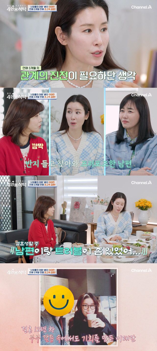 지난달 31일 방송된 채널A ‘절친 토큐멘터리 4인용 식탁’(이하 ‘4인용 식탁’)에는 이태란이 절친 하희라, 유선, 강래연과 만나 이야기를 나눴다.