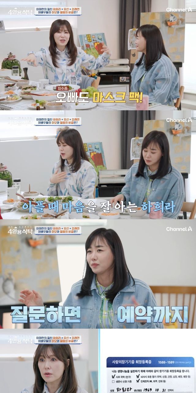 지난달 31일 방송한 채널A '절친 토큐멘터리-4인용식탁'에서는 이태란이 절친 하희라, 유선, 강래연을 초대했다.