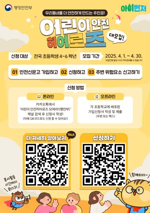 [경기연합신문 ] 행정안전부는 4월 1일부터 30일까지 ‘어린이 안전히어로즈’를 신규 모집한다고 밝혔다.