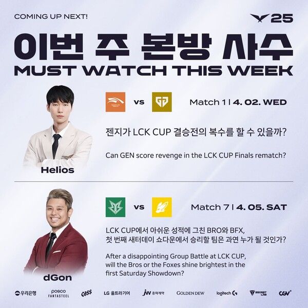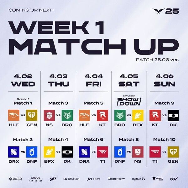 2025 LCK 정규 시즌은 4월 2일 한화생명e스포츠와 젠지의 맞대결로 포문을 연다. 한화생명e스포츠와 젠지는 2024 LCK 서머 결승전과 2025 LCK컵 결승전에서 연달아 맞붙었으며, 당시 한화생명e스포츠가 모두 승리한 바 있다.