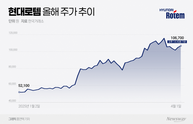 1일 한국거래소에 따르면 오후 1시 40분 기준 현대로템 주가는 전 거래일 대비 1700원(1.62%) 오른 10만6700원에 거래 중이다. 연초 5만2200원에서 시작한 주가가 올 들어 104% 급증한 것이다.