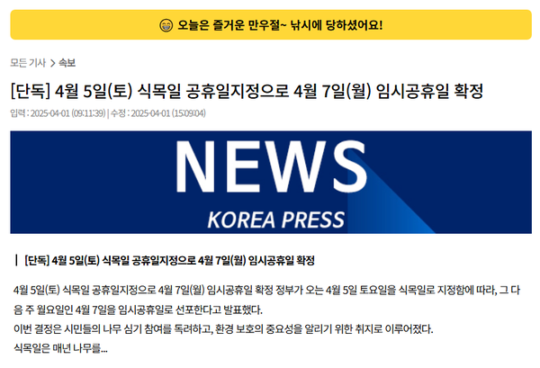 링크를 타고 들어가면 "[단독] 4월 5일(토) 식목일 공휴일지정으로 4월 7일(월) 임시공휴일 확정"이라는 제목의 가짜뉴스가 나온다.