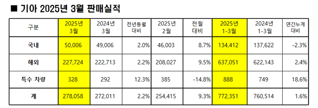 기아는 올해 1~3월 국내 13만 4,412대, 해외 63만 7,051대, 특수 888대 등 77만 2,351대를 판매했다. 이는 2024년 1분기 판매량 76만 514대보다 1.6% 증가한 수치다.
