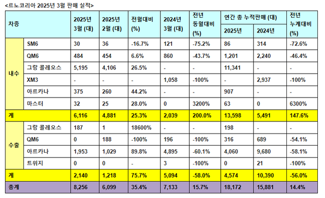 르노코리아는 지난 3월 내수 6116대, 수출 2140대로 전년 동월 대비 15.7% 증가한 총 8256대의 판매 실적을 기록했다고 밝혔다.