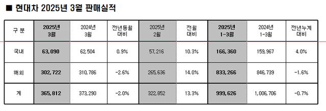 현대차는 3월 국내 시장에서 전년 동월 대비 0.9% 증가한 6만 3,090대를 판매했다.
