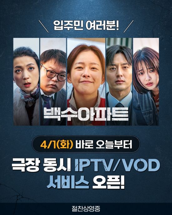 재미와 감동을 모두 잡아낸 2025년 첫 현실 공감 영화 '백수아파트'는 1일부터 IPTV(KT Genie TV, SK Btv, LG U+tv), 디지털케이블TV(홈초이스), 위성TV(KT 스카이라이프), 웨이브, 왓챠, 쿠팡플레이, 구글플레이 등 다양한 IPTV, 온라인 및 모바일 플랫폼을 통해 만나볼 수 있다. 본격적으로 안방 극장을 찾아가는 '백수아파트'는 아직 영화를 보지 못한 관객들부터 다시 보기를 원하는 관객들까지 모두를 사로잡으며 열혈 오지라퍼의 힘찬 에너지와 훈훈한 감동을 전할 것으로 기대를 모은다.