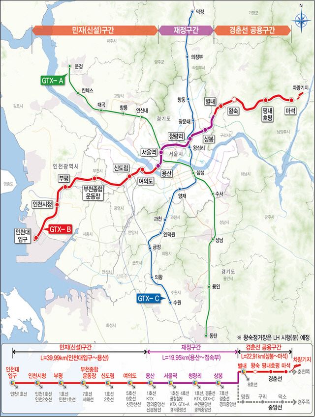 GTX B노선은 정부 재정이 2조 7774억원 투입되는 용산~상봉 20km(1~3공구는 작년 6월 착공, 4공구는 2023년 12월 착공) 구간과 4조 2894억원이 투입되는 민자 구간으로 나뉜다. 민자 구간은 인천대 입구~용산 40km, 상봉~마석 23km다.