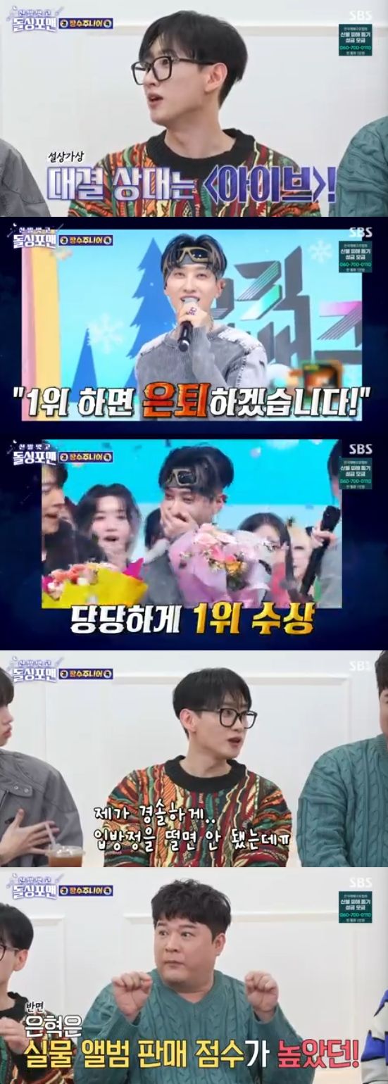 은혁은 "음악 방송에 출연했는데, 1위 공약을 물어보시더라. 그 때 대결 상대가 아이브라서 1위를 할 줄 몰랐다. 그래서 1위 공약으로 은퇴하겠다고 했다. 근데 덜컥 1위를 했다"면서 난감해했다.