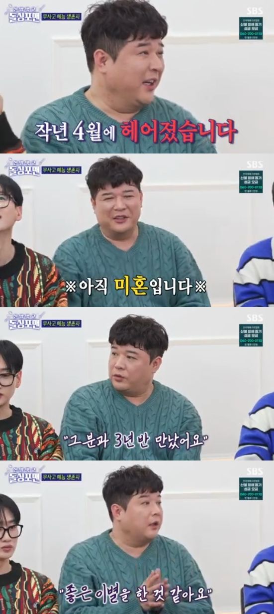 이상민은 "지난 '돌싱포맨' 촬영 때 여자친구가 있다고 하지 않았냐. 근데 헤어진거냐"고 물었고, 신동은 "헤어졌다. 3년 반 정도 만났다. 헤어지고 힘들었다"고 했다.