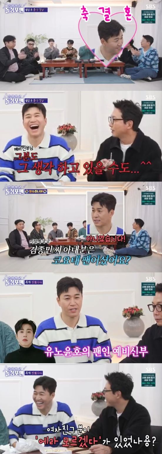 이상민은 김종민에게 "여자친구도 코요태의 팬이었냐"고 궁금해했고, 김종민은 "아니다. 여자친구는 동방신기 유노윤호의 광팬이다. 동방신기 팬클럽 카시오페아 출신"이라고 말해 눈길을 끌었다.