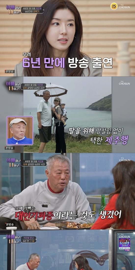 딸에게 상처를 줄까 봐 말도 꺼내지 못했다는 박한별의 아빠는 "긴 터널을 빠져나온 기분"이라는 말로 그동안의 심경을 대신했다. 우울증과 대인기피증까지 겪었다는 그는 "잠을 며칠 안자도 졸리지 않고 밥도 먹기 싫었다. 집 뒤 야산을 새벽 2시, 3시에 미친 사람처럼 돌아다녔다"라며 고통스러웠던 날들을 회상했다. 이에 대해 박한별은 "아빠가 많이 힘들어하셨다. 밤마다 술 드시고 전화하셔서 한숨만 푹 쉬셨다. 말 한마디 안 해도 숨소리만으로 고통이 느껴졌다"라고 기억했다.