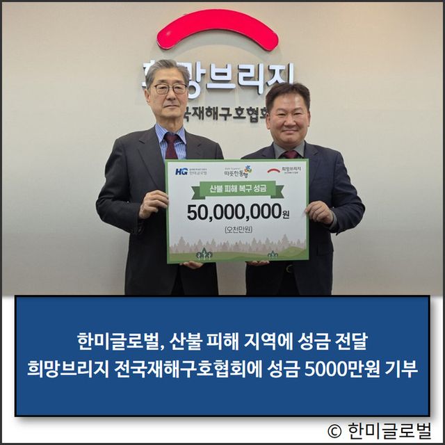 한미글로벌(053690)이 1일 영남지역에서 발생한 대규모 산불로 피해를 입은 주민들을 돕기 위해 성금 5000만원을 희망브리지 전국재해구호협회에 전달했다.