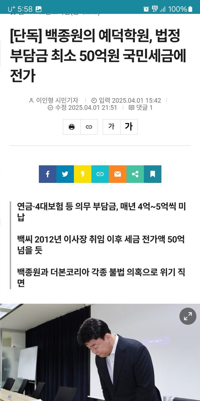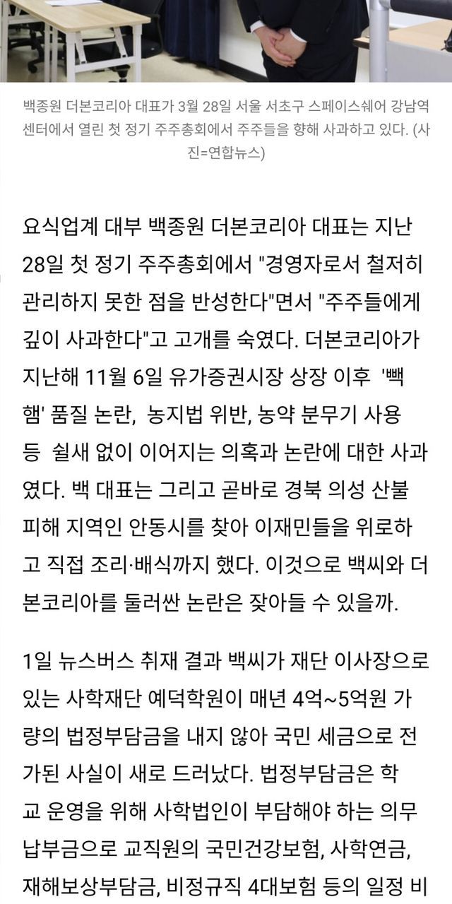 사립학원 특성상 학원에 대한 운영비를 백종원이 지급하지 않고 그 금액을 국민 세금으로 충당하고 있었고 그 금액이 무려 최소 50억 이상이라고 함