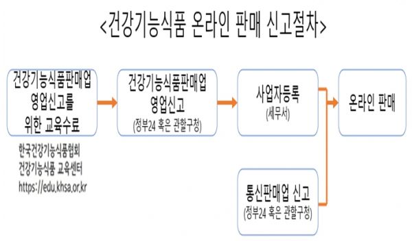 건강기능식품을 온라인으로 판매하기 위해서는'건강기능식품에 관한 법률'제6조 제2항 및'전자상거래 등에서의 소비자보호에 관한 법률'제12조 제1항에 따른 구비서류를 준비하여 관할구청에 판매업 영업신고와 통신판매업 신고를 모두 이행해야 한다.