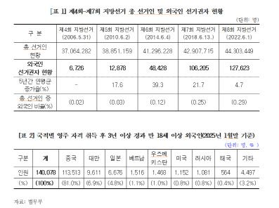 김미애 의원실이 법무부로부터 제출받은 자료에 따르면, 지난 1월 말 기준으로 지방선거 투표권을 가진 외국인은 약 14만 명에 달한다. 이 중 중국 국적자가 11만 3,513명으로 전체의 약 81%를 차지한다.