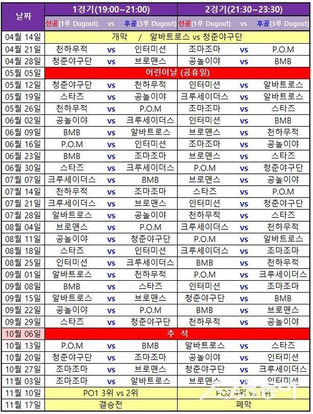 이번 리그는 14일 개막해 11월 17일까지 프로야구가 없는 매주 월요일, 고양시 고양장항야구장에서 열린다. 개막전은 14일 오후 7시 배우 조연우가 이끄는 알바트로스와 ‘광수생각’ 만화가 박광수 감독의 청춘야구단이 맞붙는다.