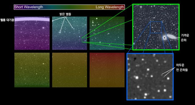 짧은 파장은 보라색-파랑색으로 표현했고, 긴 파장은 초록색-붉은색으로 나타냈다. 왼쪽 첫번째 이미지 상단의 밝은 선은 지구 대기 헬륨에 의한 것이다.