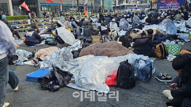 윤 대통령 탄핵심판 선고기일 이틀 전인 2일 오전 헌재 주변에서는 양측이 철야 집회를 이어가고 있었다. 이날 윤석열즉각퇴진·사회대개혁 비상행동(비상행동) 등 탄핵 촉구단체는 전날 오후 9시부터 안국역 6번 출구 앞에서 280m쯤에 달하는 도로를 차지한 채 집회를 이어가고 있다. 현장에서는 은박지와 담요, 패딩 등을 두른 채 누워 있거나 철야농성에 대비해 침낭을 챙겨온 이들도 눈에 띄었다. 집회 참가자들은 밤샘 집회에 피곤한 안색이었지만 사회자의 구령에 맞춰 “윤석열 파면” 등 구호를 외쳤다. 전날 오후 6시쯤 집회에 와 밤을 새웠다는 김소을(39)씨는 “탄핵 인용이 안 된다면 나라가 망하는 것이고 우리가 이렇게 평화적으로 집회하는 건 사법체계를 믿는다는 의미”라고 말했다.