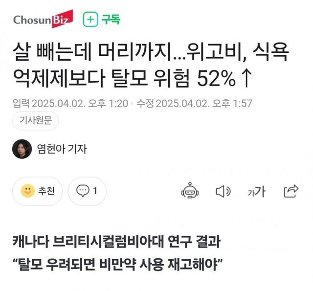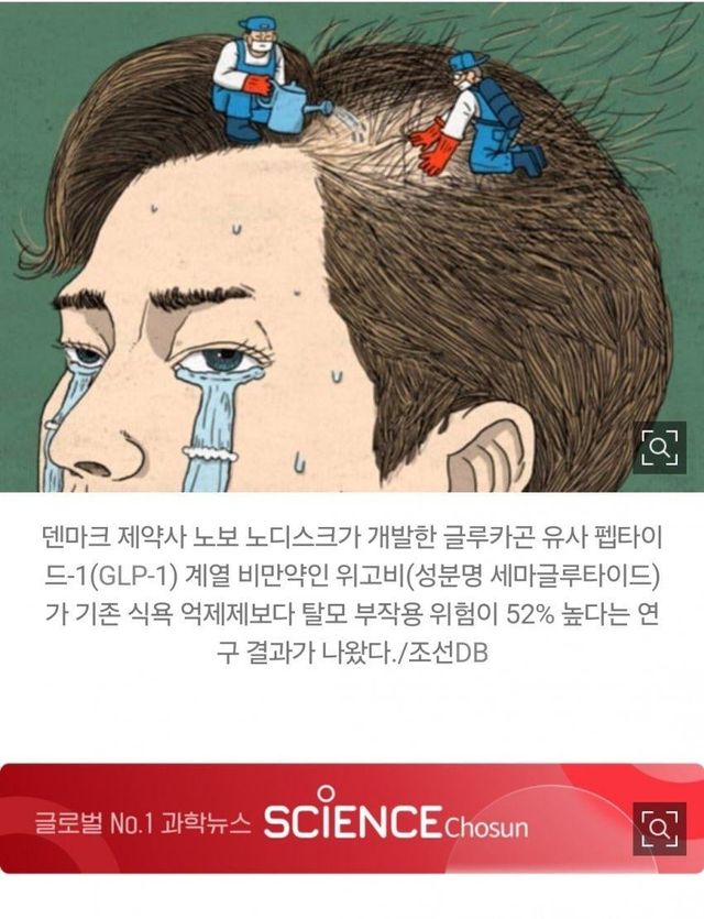 살 빼는데 머리까지…위고비, 식욕억제제보다 탈모 위험 52%↑탈모인은 상관X