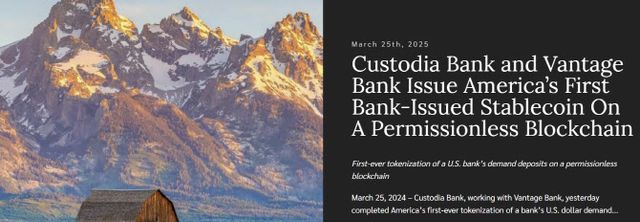 최근 와이오밍주의 가상자산 전문 은행이자 디지털 자산 보관기관인 커스토디아은행이 밴티지은행과 협력해 실물 예금 기반의 스테이블 코인 ‘아비트(Avit)’를 발행했다고 밝혔다. 이들은 은행 고객을 위한 새로운 미국 달러 결제 수단으로 아비트를 선보였다.