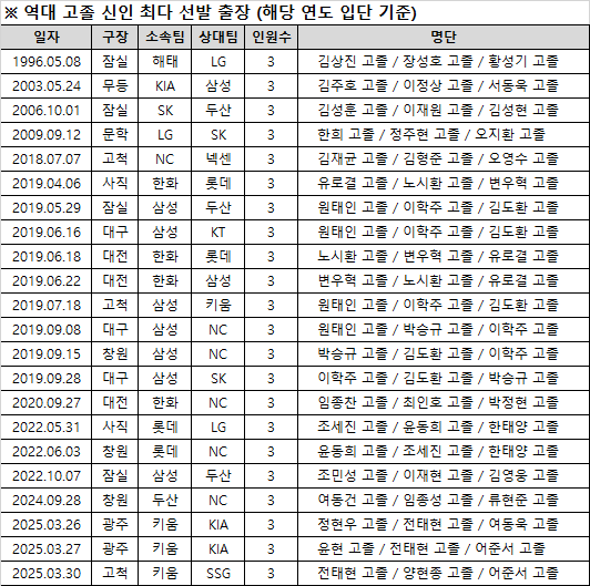 키움은 신인 선수 4명을 선발 라인업에 넣었다. 전태현, 어준서, 양현종 그리고 윤현. 이는 역대 한 경기 고졸 신인(당해 기준) 신인 선수 최다 선발 출장 기록이다. 종전 최다는 3명이었다.
