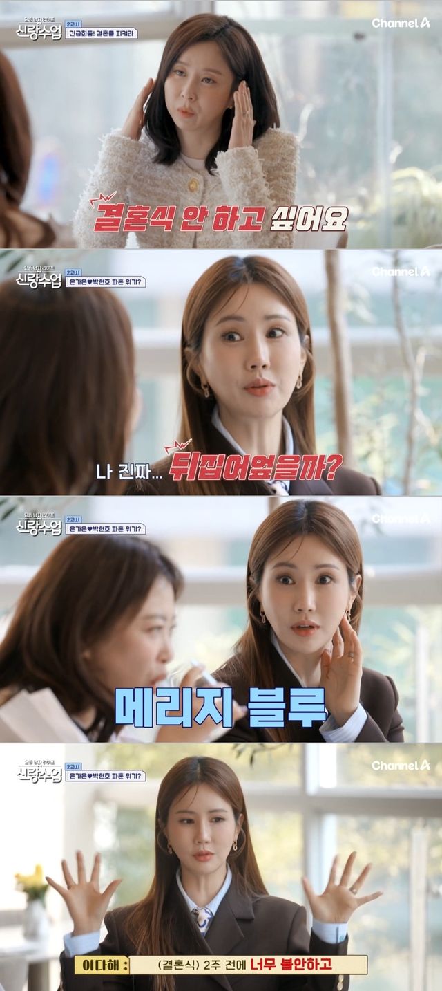 이다해는 이에 "그럴 수 있다. 완전. 나는 결혼 2주 전에 제일 힘들었다. 진짜 뒤집어엎을까 정말 그랬다. 진짜였다"며 "2주 전에 너무 예민했다. 나중에 알았는데 메리지 블루라더라"라고 자신의 경험을 이야기했다.
