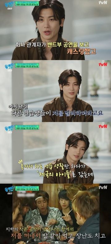 박형식은 "머물던 회사가 있는데 그 회사가 처음에 저를 밴드 대회에서 캐스팅한 분이다. 저는 캐스팅이 됐고, 다른 연습생들은 오디션을 보고 오신 분들도 좀 있었다. 어찌 보면 내가 낙하산처럼 보일 수가 있었다"고 운을 뗐다.