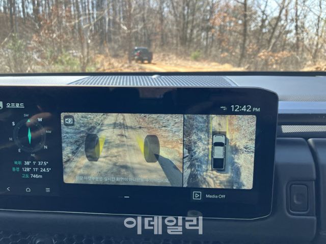 터프한 오프로드 주행을 완성시키는 건 섬세한 주행 기능들이다. 기아는 2속 ATC(후륜 기반 사륜구동 시스템) △전자식 차동기어 잠금장치 △전용 터레인 모드 등 오프로드 성능을 구현하기 위한 다양한 기술을 적용했다. 눈길, 모래, 진흙 등 다양한 주행 상황에 따라 4개의 구동 모드(2H·4H·4L·4A) 중 하나를 선택할 수 있다. 경사가 급한 곳에서는 앞 시야가 제한되는데 도로에서 이탈하지 않도록 운전석 디스플레이에 가상의 바퀴를 띄워 내가 어디로 가고 있는지 볼 수 있었다.