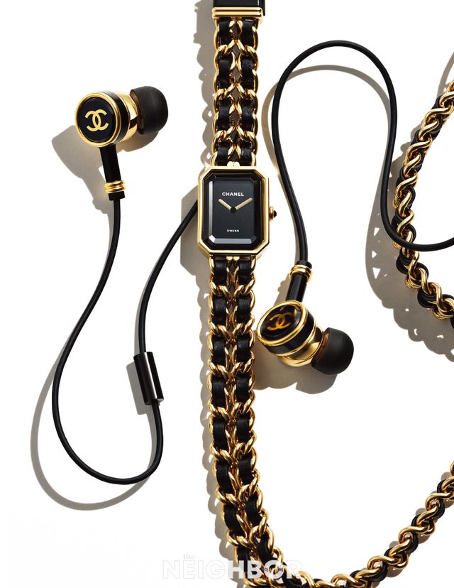 N°5의 팔각형 스토퍼를 차용한 케이스 위 간결한 블랙 래커 다이얼로 시간을 확인할 수 있는 프리미에르 사운드. 옐로 골드 코팅 스틸과 블랙 가죽을 엮은 체인 네크리스에 결합한 이어폰은 탈착 가능하다. 2천2백80만원.