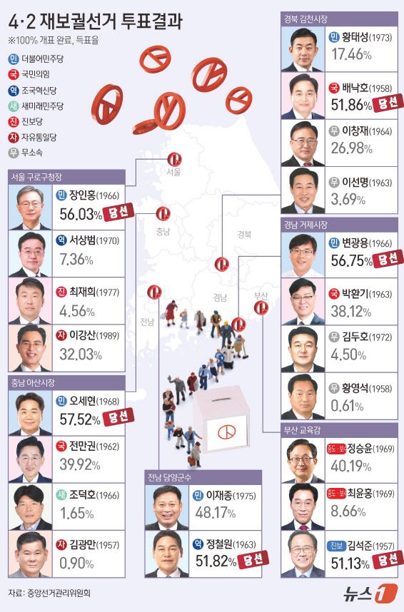 3일 중앙선거관리위원회에 따르면 4·2 재보궐 선거는 서울 구로구청장, 충남 아산시장, 전남 담양군수, 경남 거제시장, 경북 김천시장 등 5곳의 기초단체장과 광역·기초의원 23곳, 그리고 부산 교육감 선거로 치러졌다. 기초단체장 선거에서는 더불어민주당이 3곳, 조국혁신당이 1곳, 국민의힘이 1곳에서 각각 승리했다.