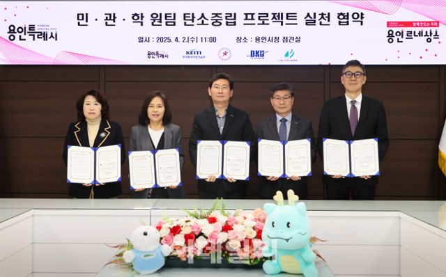 지난 2일 이상일 용인특례시장과 김용국 한국환경산업기술원 친환경안전본부장, 김희정 용인교육지원청 교육장, 김재일 단국대학교 대외 부총장, 최미영 (사)용인시어린이집연합회 회장은 용인시청에서 ‘민·관·학+ 원팀 탄소중립 프로젝트 실천 협약’을 체결했다.