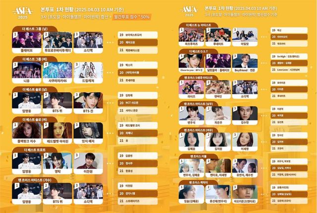 ASEA 2025 본투표 1차는 오는 6일 자정에 마감되며, 각 부문 상위 20위 이내 후보만이 4월 10일부터 시작되는 본투표 2차에 진출할 수 있다. 3사 합산 기준 최종 결과는 오는 7일 정오 ASEA 공식 홈페이지를 통해 발표되며, 월간 점수 반영 부문 순위는 4월 8~9일 사이 별도 공개될 예정이다.