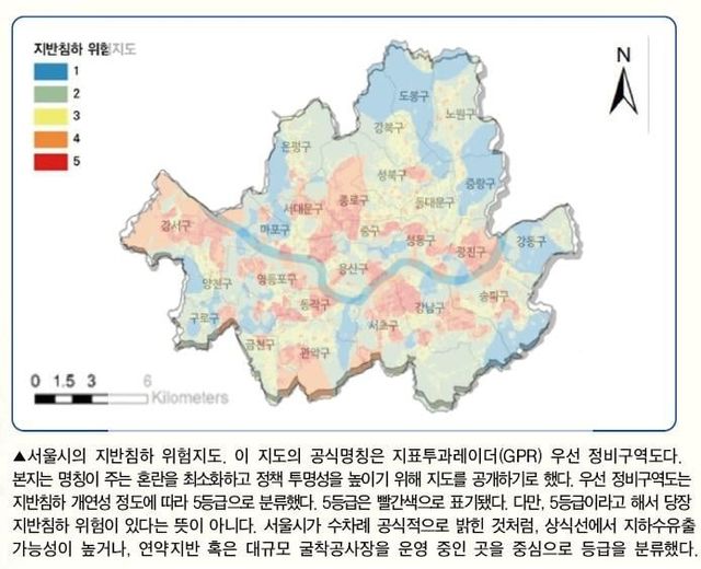<대한경제> 단독입수한 서울시의 ‘지반침하 위험지도’에 따르면, 각종 공공청사부터 오피스지역이 밀집한 도심권역과 강남권역, 그리고 서남권역인 강서ㆍ양천ㆍ관악구 지역이 위험등급 5등급 지역인 것으로 나타났다.