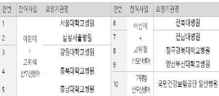 선정된 의료기관은 서울대학교병원, 삼성서울병원, 강원대학교병원, 충북대학교병원, 충남대학교병원, 전북대병원, 전남대병원, 칠곡경북대학교병원, 양산부산대학교병원, 국민건강보험공단 일산병원이다.