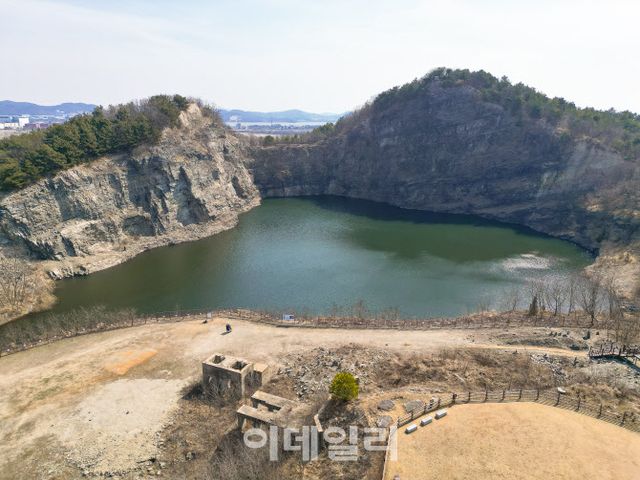 퇴적암층 뒤로는 채석장으로 쓰였던 시절에 만들어진 오래된 구조물이 남아 있다. 카페나 복합문화공간으로 활용할 만한 시설이지만 아직은 오롯이 옛 모습을 간직하며 장소에 운치를 더하고 있다.