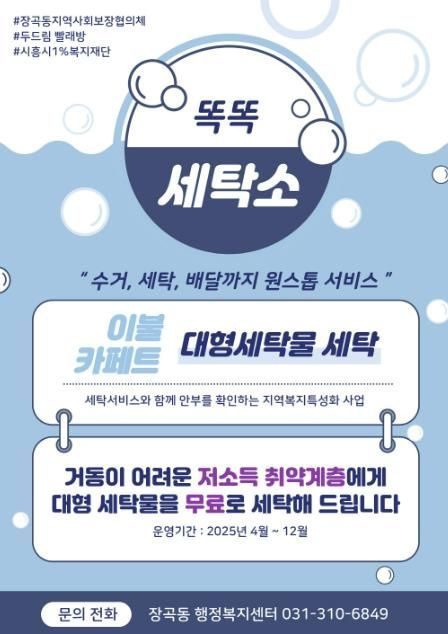 ‘똑똑 세탁소’는 혼자 사는 어르신, 장애인, 질병 등으로 대형 이불 세탁이 어려운 주민을 위한 장곡형 복지특화사업의 일환이자, 시흥시1%복지재단 지역복지특성화사업으로 고독사 예방을 위해 추진된다.