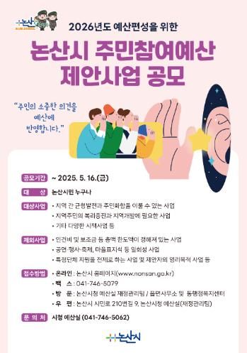 [저스트 이코노믹스 김지윤 기자] 논산시는 오는 5월 16일까지 ‘2026년도 예산편성을 위한 주민참여예산 제안사업 공모’를 진행한다.