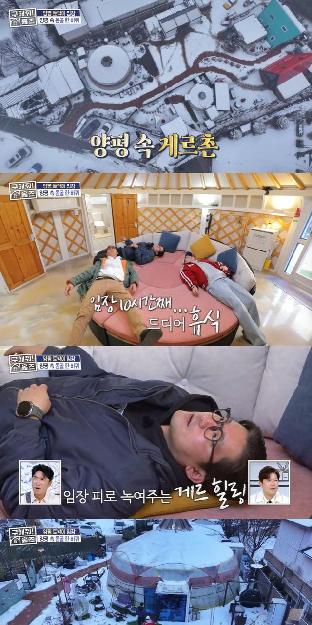 촬영 10시간째에 지친 세 사람은 갑자기 '눕방'을 선보이기도. 노곤해져 잠시 휴식하는 장면이 나오자 양세형은 "저 안이 되게 따뜻하다"며 소개했다.